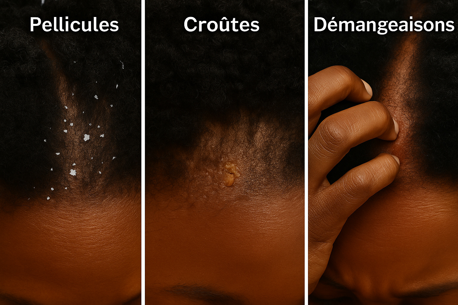 Comparatif visuel entre cuir chevelu sec, cuir chevelu sensible et cuir chevelu irrité sur cheveux crépus avec signes distinctifs